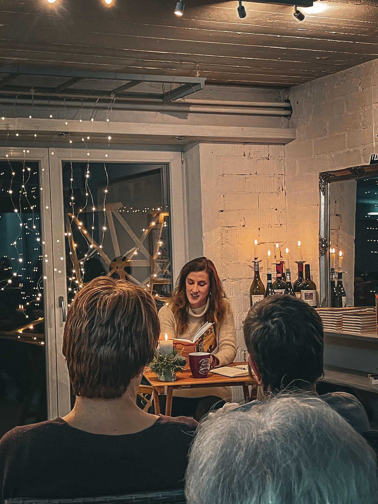 Es war ein zauberhafter Weihnachtsabend im Bijou11 – Vor der Lesung gab es leckeren Punsch, Glühwein und frische Waffeln. Die vielen Kerzen und Lichter versetzten alle Gäste in die richtige Stimmung. Vielen Dank liebe Sarah, dass du diesen Anlass ermöglicht hast! Es war einfach wunderbar!